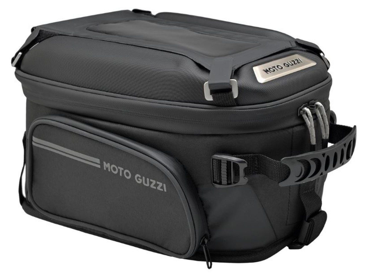Eleganter 10-Liter-Tankrucksack der Marke Moto Guzzi mit praktischem Design: Er kann zum Transport der Brieftasche, des Telefons und anderer Gegenstände verwendet werden. Regenschutz und wasserdichte transparente Tasche sind im Lieferumfang enthalten, mit letzterer, die ein Mobiltelefon für GPS-Einsatz aufnehmen kann. Tankrucksack-Gurtzeug ebenfalls enthalten. Passende Hecktasche ebenfalls erhältlich.